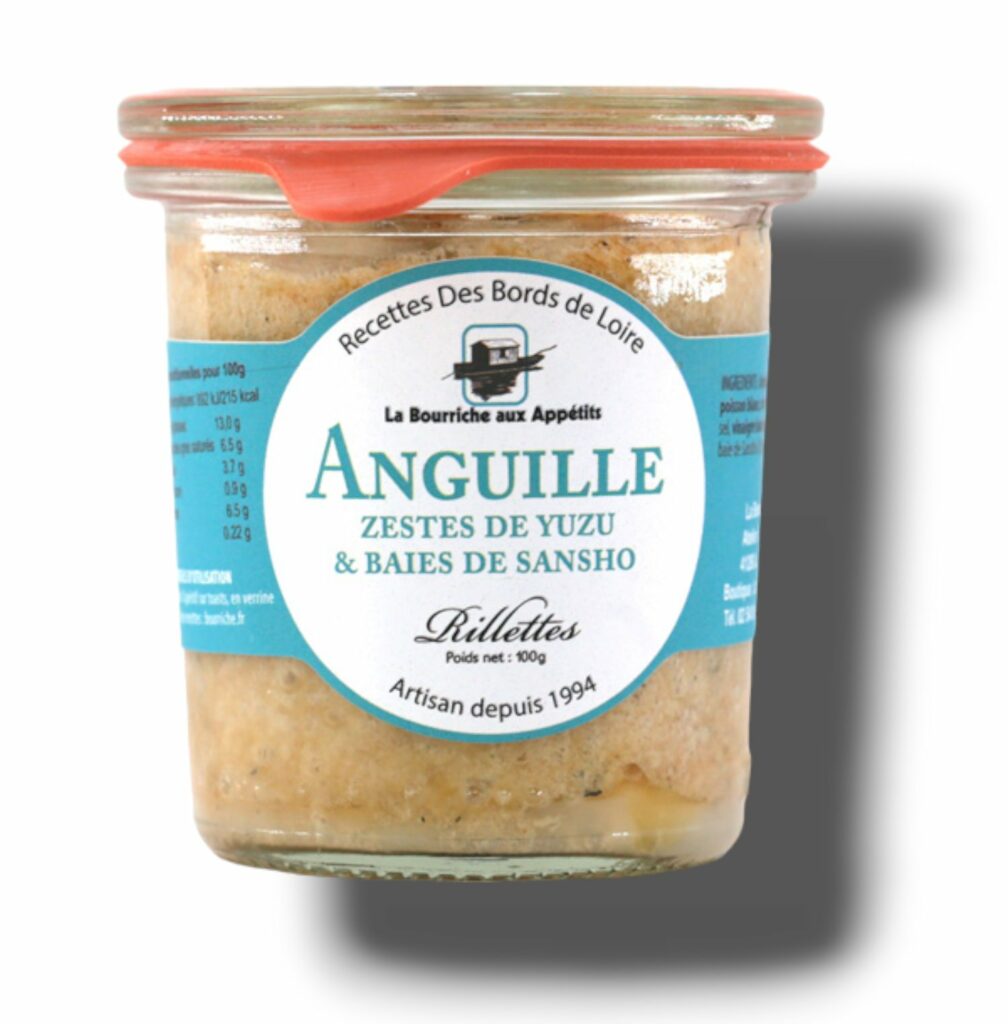 5,95 €/kg / Unitésoit 39,67 €/kgRILLETTES D’ANGUILLE AUX ZESTE DE YUZU ET BAIE DE SANSHO 100 GR